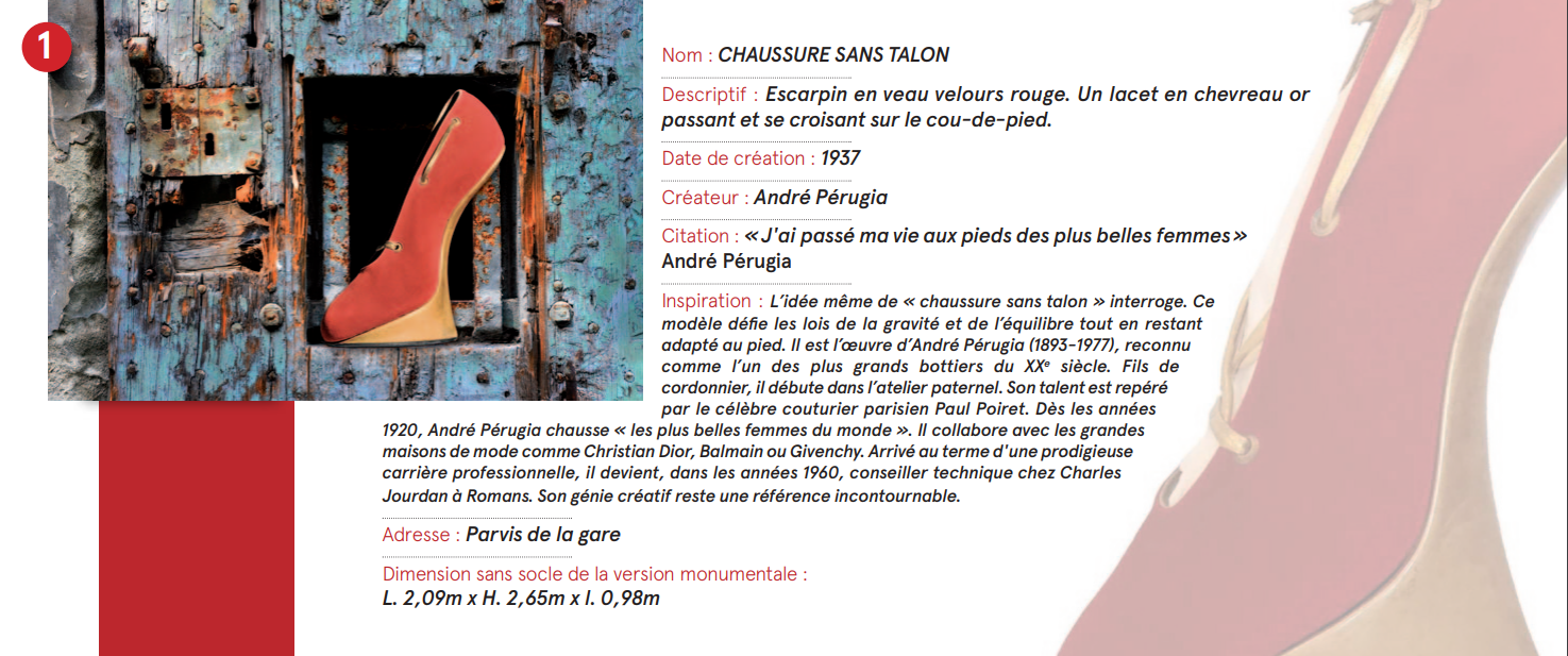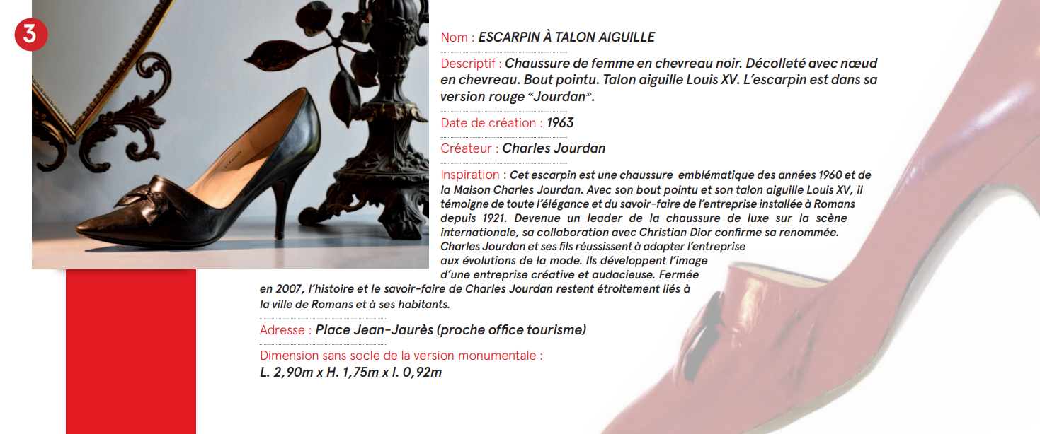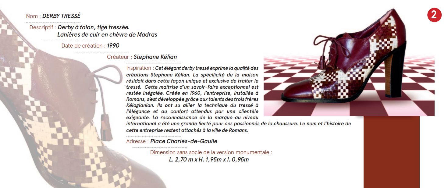 Inspirées de modèles emblématiques exposés au musée de la Chaussure, ces œuvres rendent hommage à la créativité et à la technique de grands chausseurs, tels que Roger Vivier, Stéphane Kélian, Charles Jourdan ou encore Robert Clergerie. La chaussure fait véritablement partie de l’ADN de la ville de Romans. Elle fait partie de son histoire industrielle, mais elle fait aussi partie de son présent. Le musée de la Chaussure, référence internationale en la matière et source d’inspiration pour de nombreux créateurs en est un bel exemple, tout comme les nombreux chausseurs romanais, qui continuent à faire rayonner notre ville.