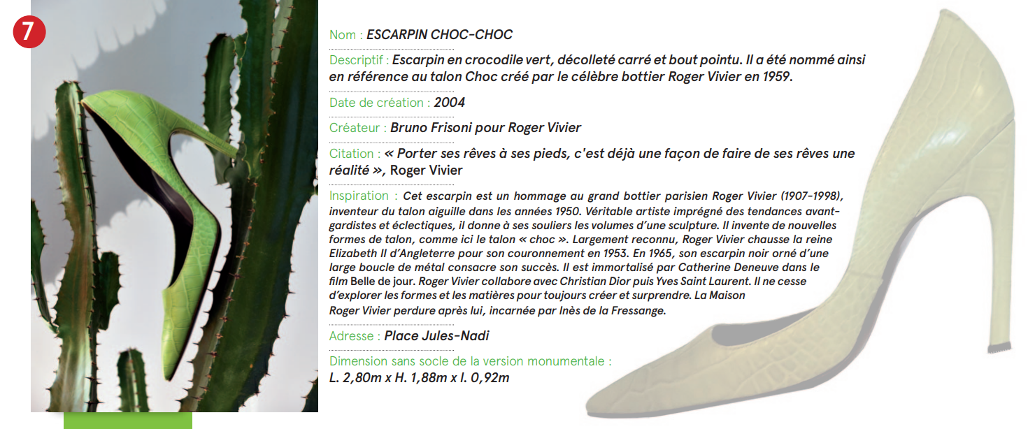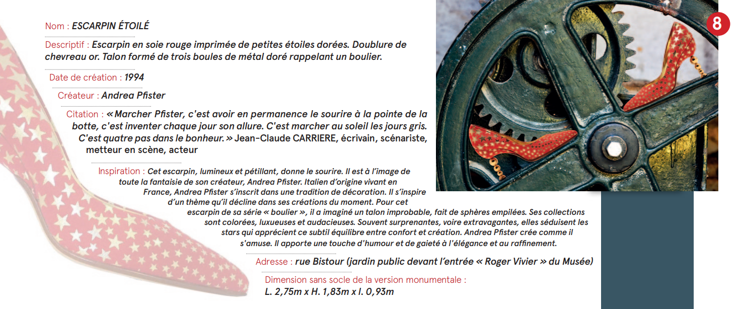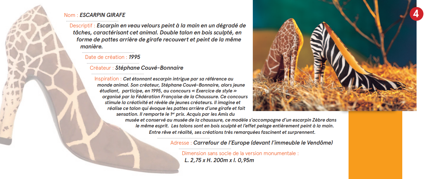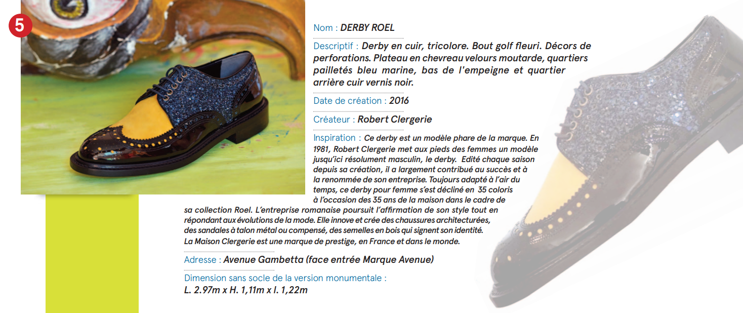 Les 11 chaussures monumentales -de 2m de haut environ- sont implantées en centre-ville le long d’un parcours marchand.